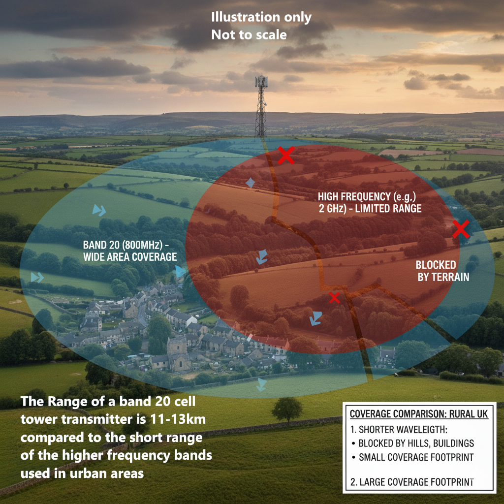 This illustration vividly demonstrates the critical difference in 4G radio coverage between high-frequency bands (like 2GHz and above) and the lower-frequency Band 20 (800MHz), particularly relevant for rural areas.